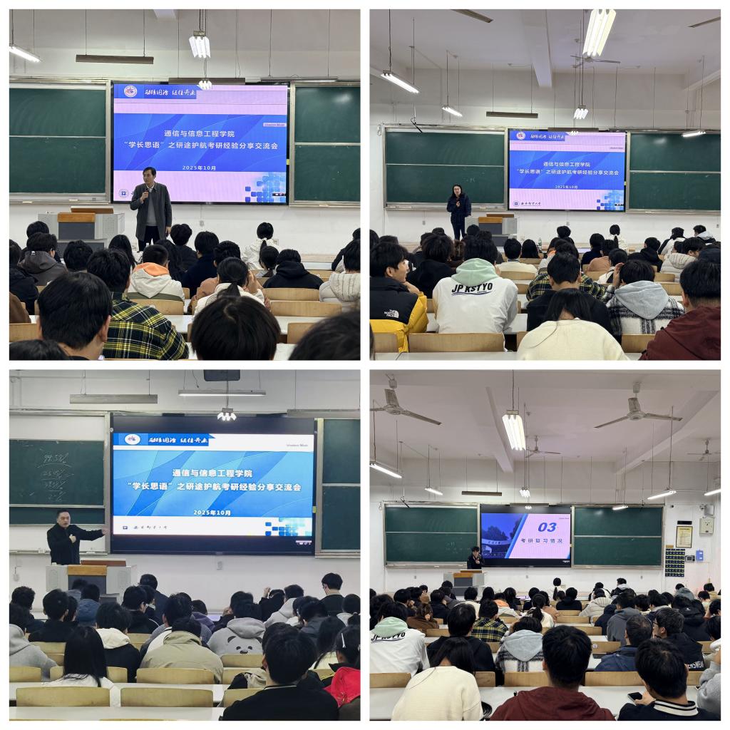 陈伟超主持报考本校的专场分享会,他介绍了学院研究生培养情况与就业优势,强调要在考研冲刺阶段稳住心态,打牢基础,查漏补缺,把报考本校的“主场优势”转化为“一战成硕”的动力。薛建介绍了学院各科研团队的基本情况,鼓励学生依托学院成熟的培养体系和熟悉的导师团队,高效地实现学术提升与职业发展的双重目标。学院2025届物联网工程专业本科毕业生、信息与通信工程研一学生冯傲峰,介绍了自己专业课考取高分的复习技巧和重点难点。